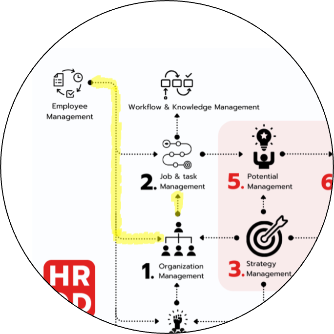 สำหรับ Job & Task Management นั้นจะเป็น Engine ที่รับข้อมูลและทำงานสอดประสานงานกับ Employee Management และ Organization Management อย่างใกล้ชิด เพื่อทำหน้าที่หลัก สำหรับการกำหนด " เอกสารมาตรฐานการทำงานของตำแหน่งงาน (JS : Job Specification) ให้สอดคล้องกับ Position ที่ถูกกำหนดมาจาก Organization Chart และมอบหมาย แจกจ่ายหน้าที่การทำงานให้เป็นรายบุคคล ผ่าน " เอกสารกำหนดหน้าที่การทำงานรายบุคคล (JD : Job Description)